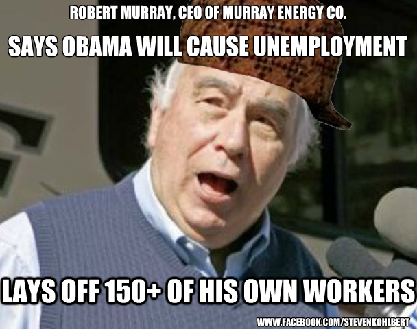 Robert Murray, chief executive of Murray Energy Co., the largest privately held coal company in America, blamed the layoffs on President Obama -- and, by extension, the voters who elected him -- in a memo to employees.