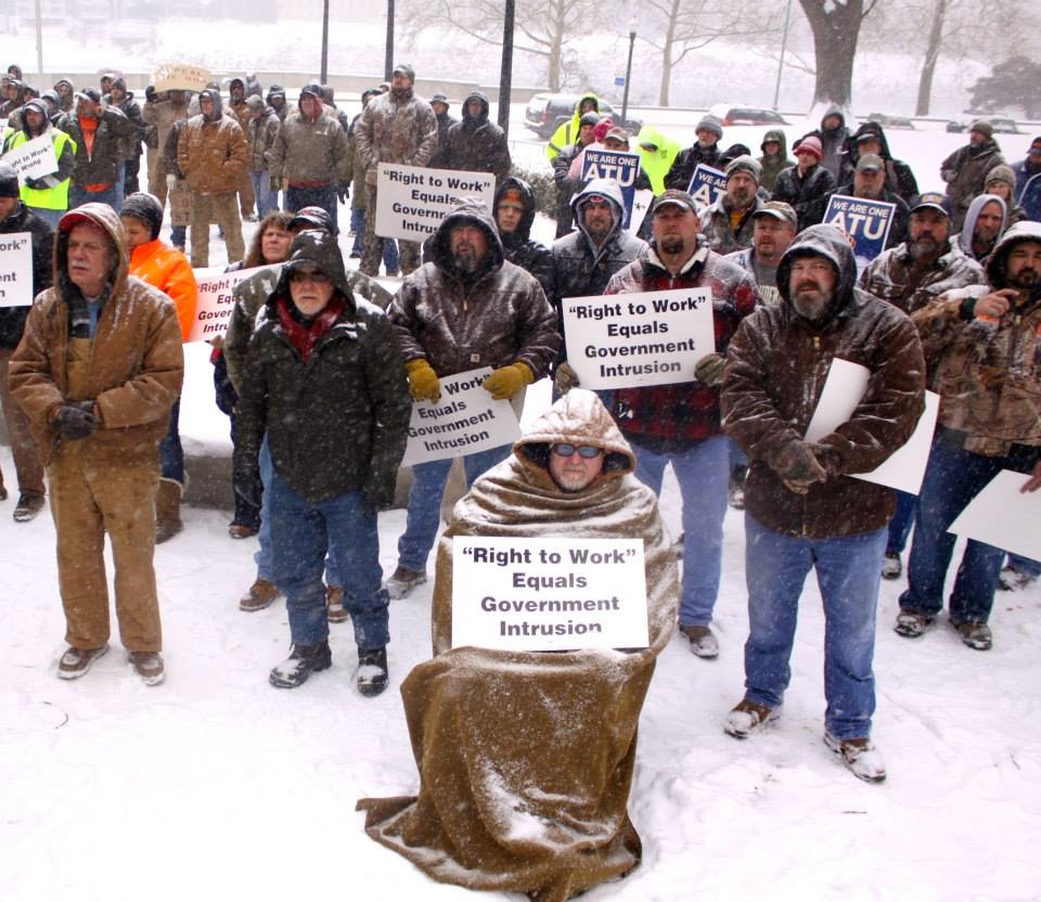 On Monday, many Teamsters joined their fellow union members in a crowd of more than 1,000 workers to protest legislation to establish right to work and to prohibit prevailing wages. Despite severe winter weather, below-freezing temperatures and heavy snowfall, the workers came from all over the state in an incredible display of solidarity.